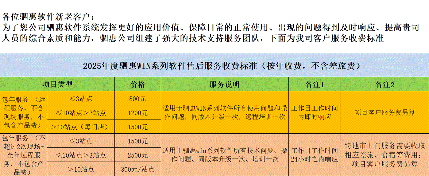 为了您公司驷惠软件系统发挥更好的应用价值,保障日常的正常使用,出现的问题得到及时响应,提高贵司人员的综合素质和能力,驷惠公司组建了强大的技术支持服务团队,下面为我司客户服务收费标准。